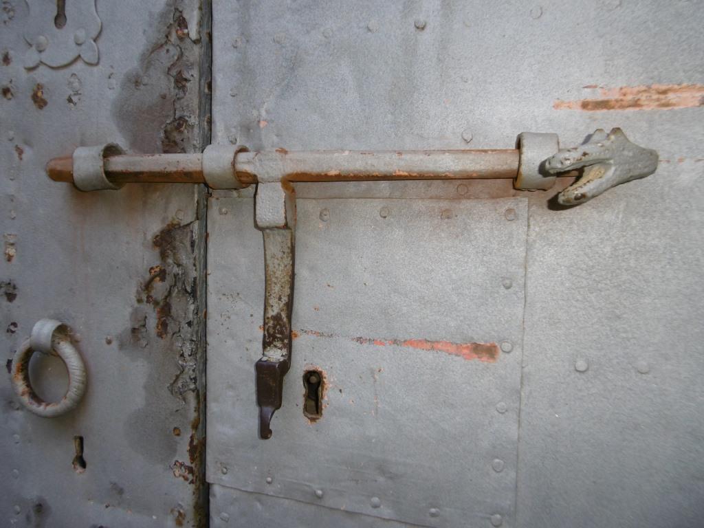 La porta presenta el forrellat de ferro forjat. La part més llarga acaba en un cap de serp. Les tres argolles són llises excepte la central, que té un dibuix incís de ratlles i ones. L'element que tanca dins el pany és d'una altra peça reforçada.